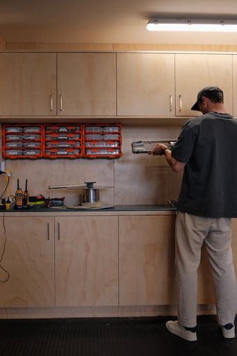 The palette is refined, yet hardwearing and suited to the industrial nature of the work. Ground concrete, steel purlins and ply lined walls define the lower workshop spaces. While dark timber joinery and a fully wrapped stainless steel island are the center piece of the social space. The resultant atmosphere is the culmination of traditional marine knowledge, modern technology and a young company that fits perfectly into their laid-back, coastal surrounds.